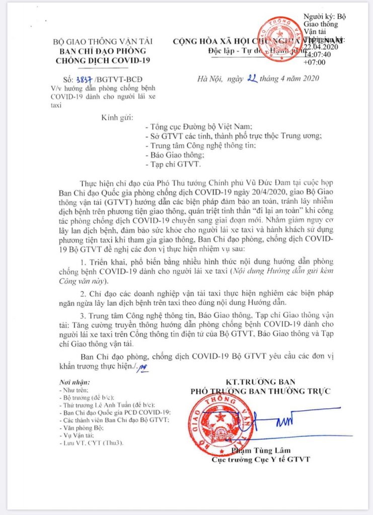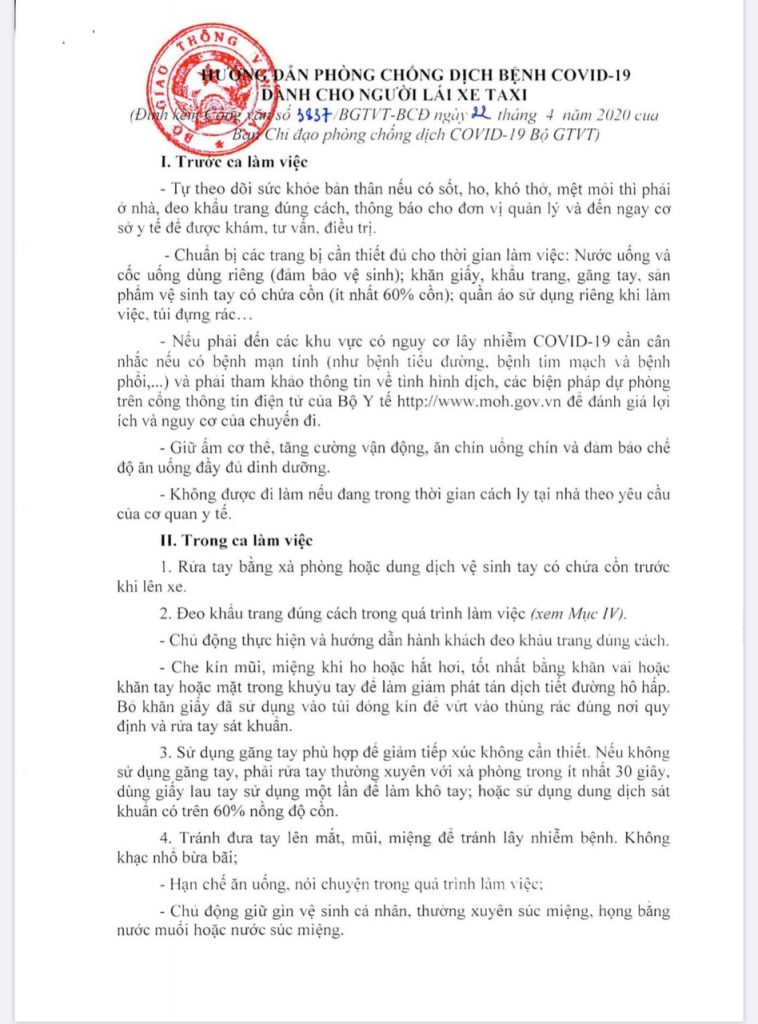 Ngày 23/4/2020, Sở GTVT Hà Nội đã ban hành số 2631/SGTVT-QLVT về việc hướng dẫn phòng chống dịch Covid-19 dành cho lái xe taxi.