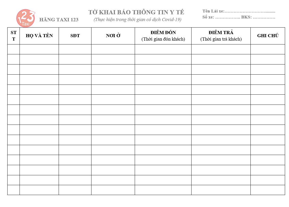 Mẫu Khai báo thông tin y tế hành khách – Taxi 123