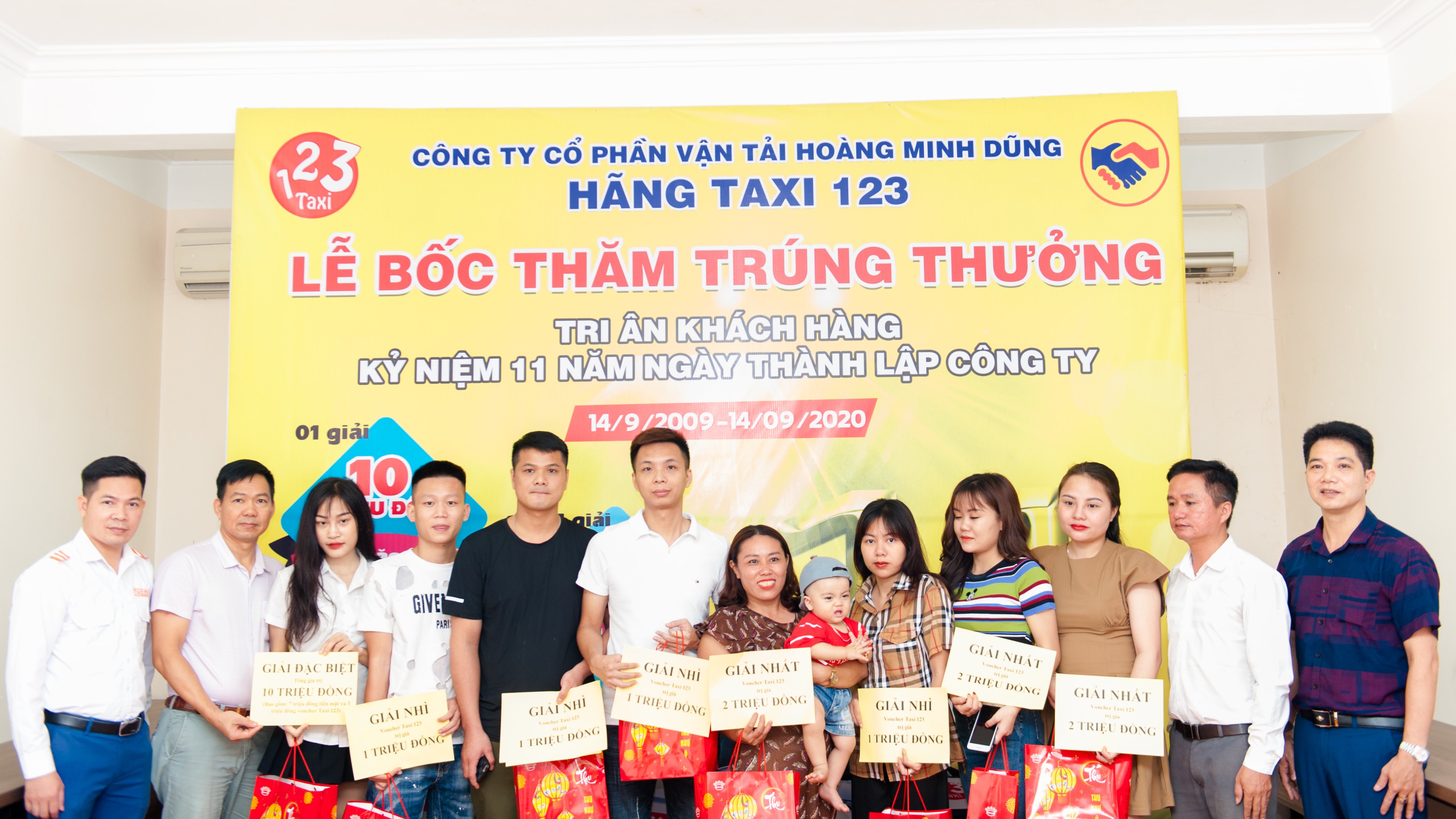 Ngày 22/9/2020 vừa qua, tại Văn phòng hãng Taxi 123 đã diễn ra buổi trao giải Nhì, Nhất và Đặc biệt cho những khách hàng may mắn trúng giải trong buổi Bốc thăm trúng thưởng kỷ niệm 11 năm thành lập Công ty CPVT Hoàng Minh Dũng.